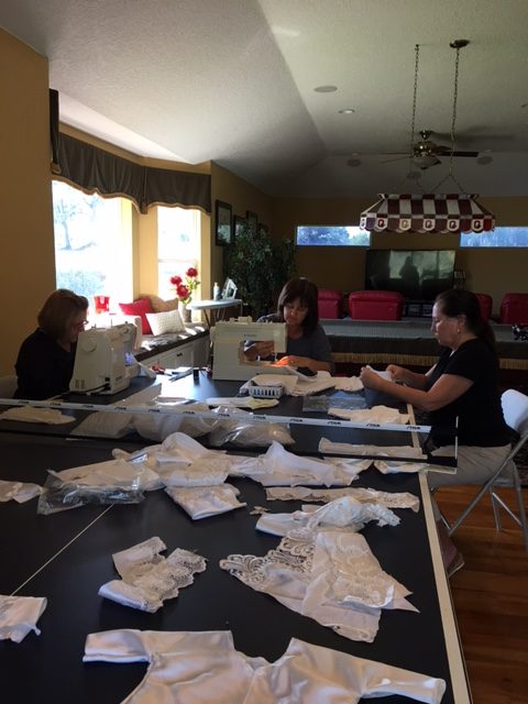 After reading about the various programs that use donated wedding dresses to create burial gowns, bonnets and wraps for infants who are stillborn, or preemies that pass after birth, members of the GFWC Woman’s Club of New Tampa decided to do their part in helping grieving parents and created 14 micro-preemie “angel wraps” with bonnets and three burial gowns to be delivered to the Bereavement Team at Florida Hospital Tampa later this month. A white satin wedding dress was donated by a club member and the over 10 yards of fabric, embellishments and lace was used to create these one-of-a-kind items for parents of children who will not reach their first birthday. Each wrap and gown are unique; the Bereavement Team plans on distributing them to families for final pictures and as a remembrance of the child lost too early.